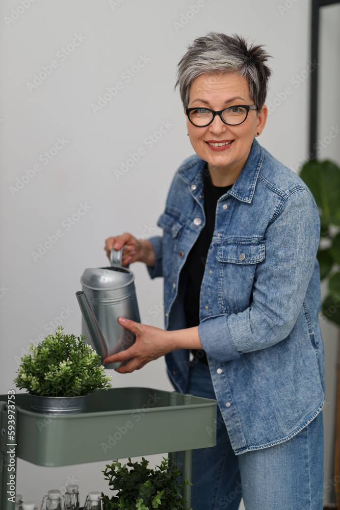 Positive senior woman with a watering can watering potted home flowers.