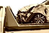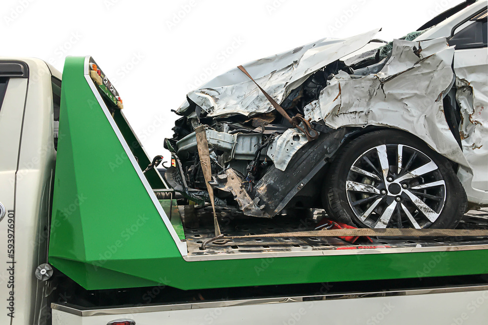 Front view of a damaged white car in a road accident on a rickshaw. PNG