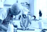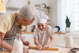 Happy family in kitchen. Grandmother and granddaughter child cook in kitchen together. Grandma teaching kid girl roll out dough bake cookies. Household teamwork helping family generations concept