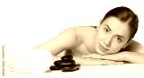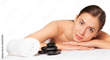 Beautiful young woman receiving hot stone massage at salon spa