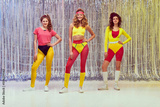 Three beautiful, young women in colorful, bright sportswear, bodysuits training aerobics and stretching exercises. Positve mood. Concept of retro fitness, sport, 80s fashion, beauty, health
