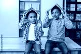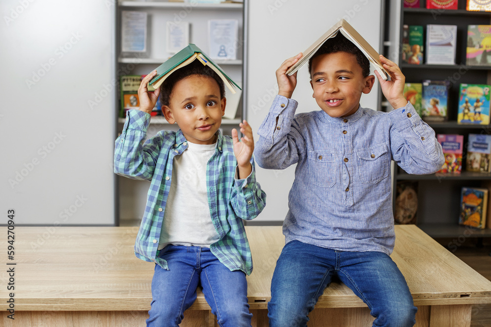 Two African American children are reading book, studying at school and having fun. Back to school.