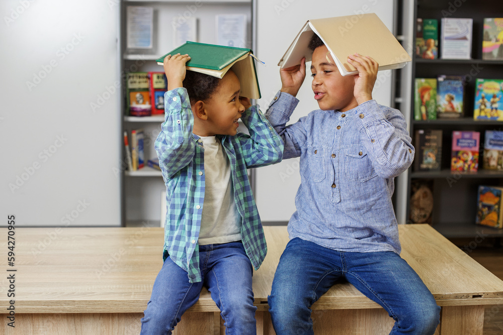 Two African American children are reading book, studying at school and having fun. Back to school.
