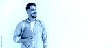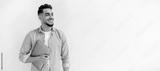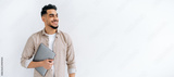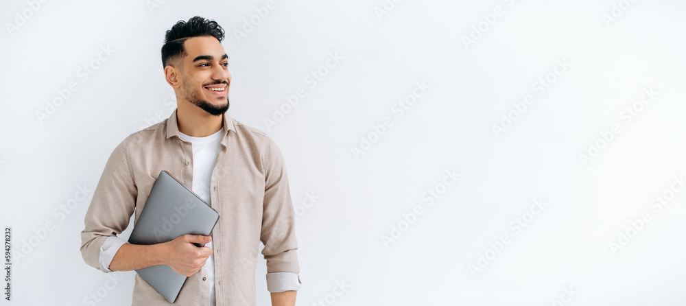 Panoramic photo of happy arabian or indian man with beard, in casual shirt, standing on isolated white background, holding laptop, looking to the side, smiling joyfully, dreaming, thinking. Copy-space