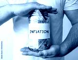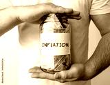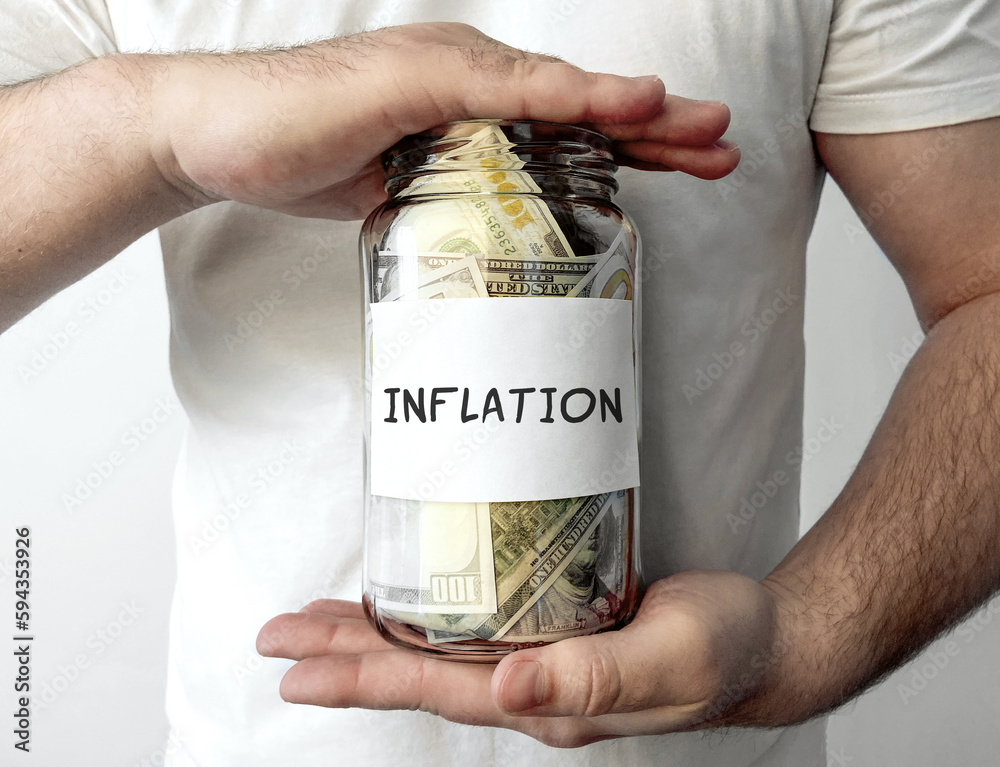 Man holding glass jar with with money inside with word INFLATION