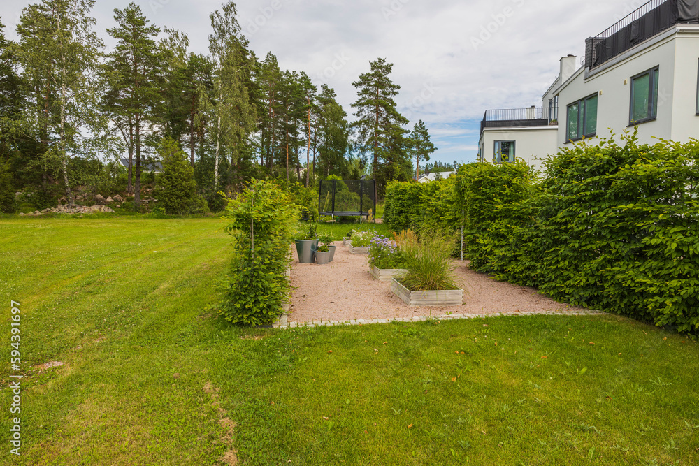 Beautiful green nature landscape view. While modern houses with green bushes and trees on backyard. Sweden.