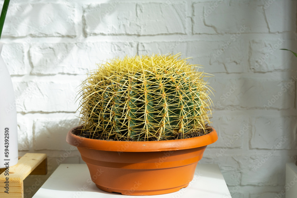Large echinocactus Gruzoni in the interior against the background of a white brick wall. Home crop production, big cactus in a pot