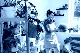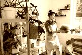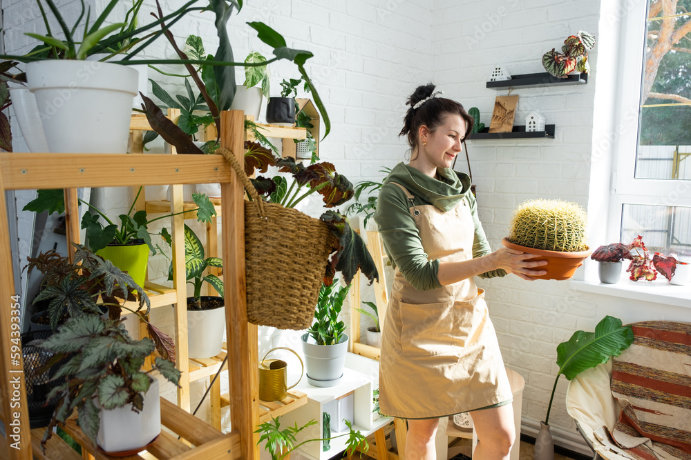 Large echinocactus Gruzoni in the hands of a woman in the interior of a green house with shelving collections of domestic plants. Home crop production, plant breeder admiring a cactus in a pot