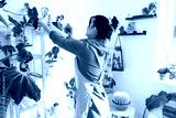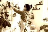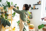 Woman plant breeder examines and admires home plants in a pot from her collection at home on the shelves. Search for pests, care, watering, fertilizers. Home crop production