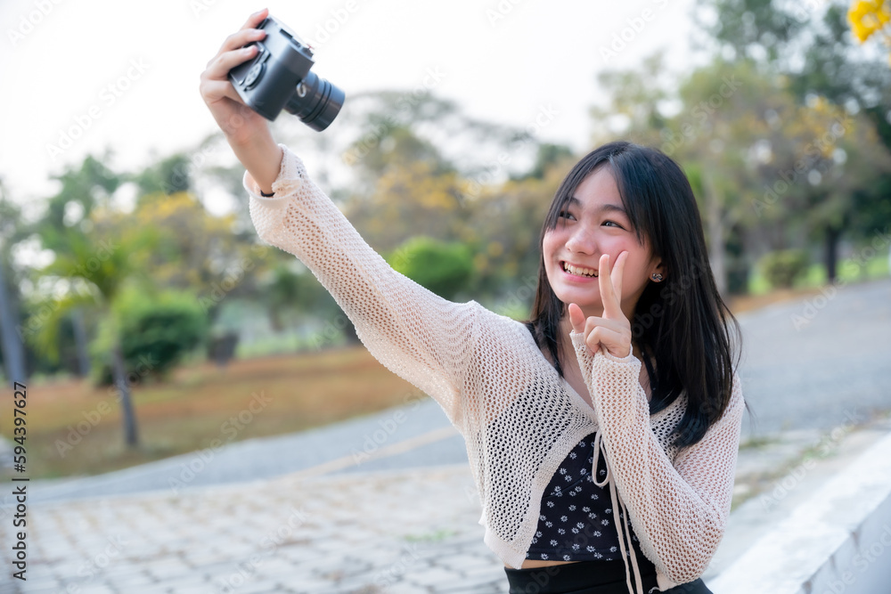 Portrait cute smiles Asian of attractive young teenage girl Take a selfie with a the camera in blooming flowers with the park in spring day at Evening background in Thailand.