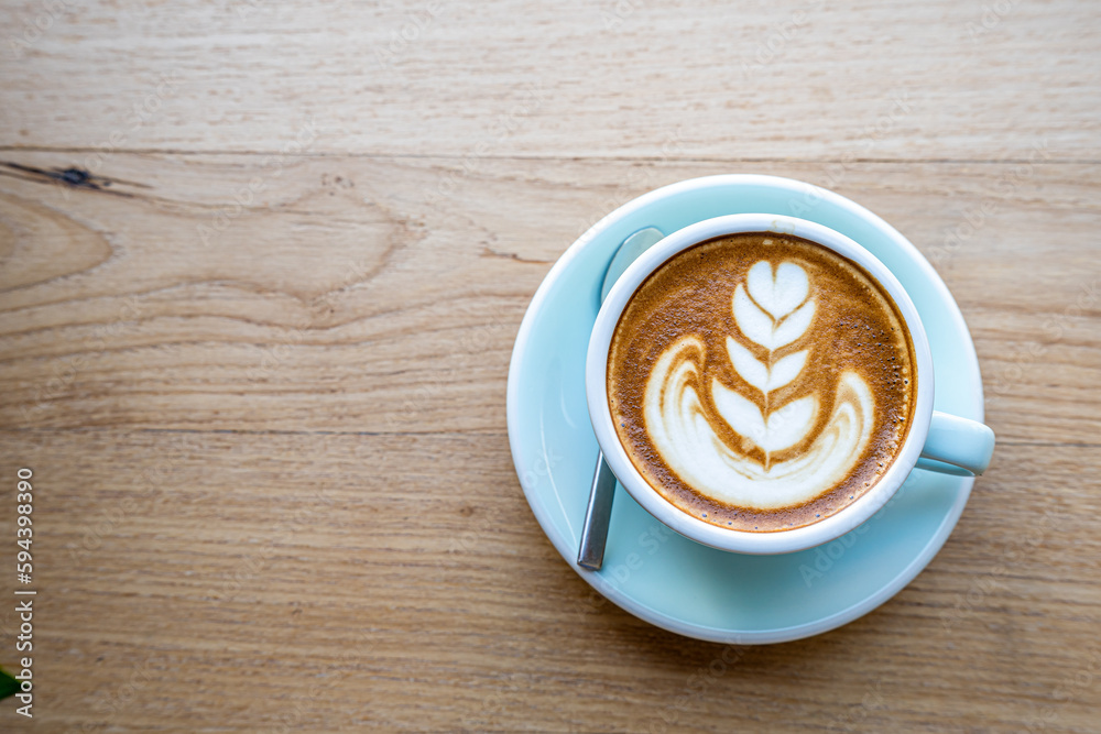Hot coffee latte with latte art milk foam in cup mug on wood desk on top view. As breakfast In a coffee shop at the cafe,during business work concept