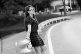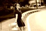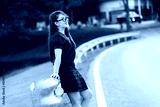 Happy Relaxing Portrait asian woman Wear dark blue dress while sitting on green grass lawn beside a reservoir at the city park outdoors.