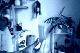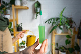 Drip fertilizer for potted plants, stimulator of development, growth acceleration, home plant care. A bottle of liquid is inserted in the hand of a woman. Home crop production