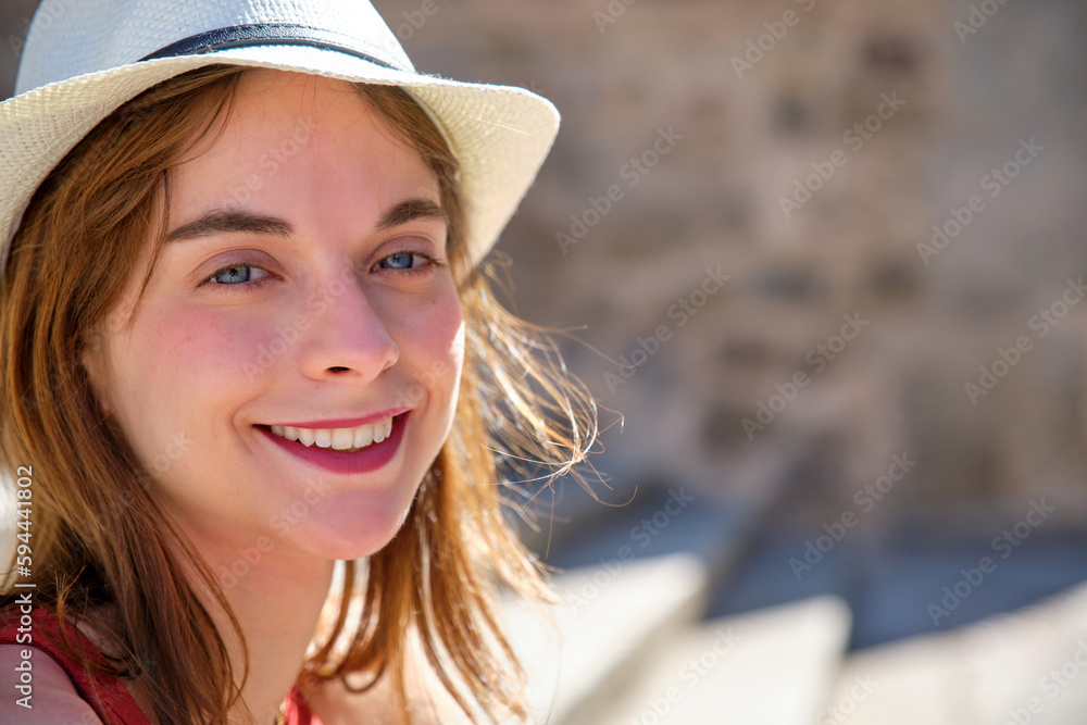 close-up portrait of smiling blue eyes redhead young girl in white hat looking at camera