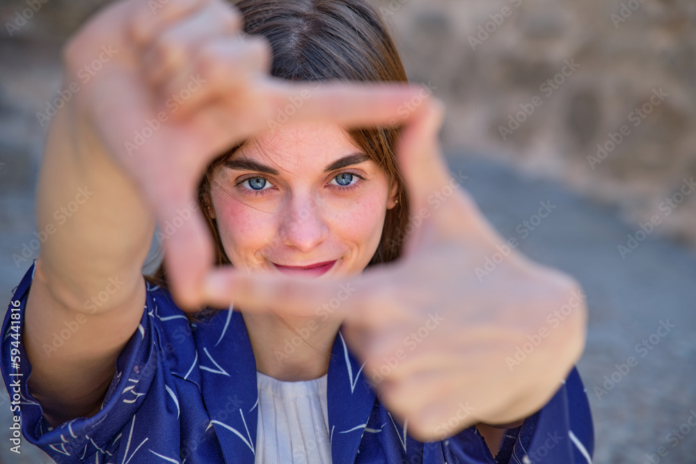 portrait of a very pretty young girl with blue eyes looking through a frame formed by her hands