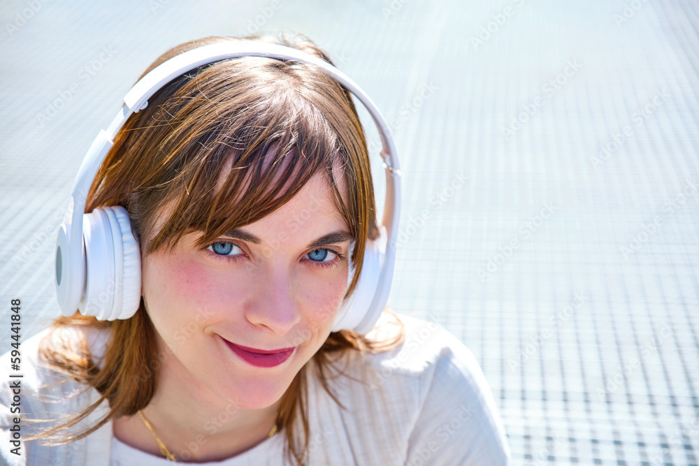 portrait of blue eyes redhead young girl in headphones listening to music looking at camera
