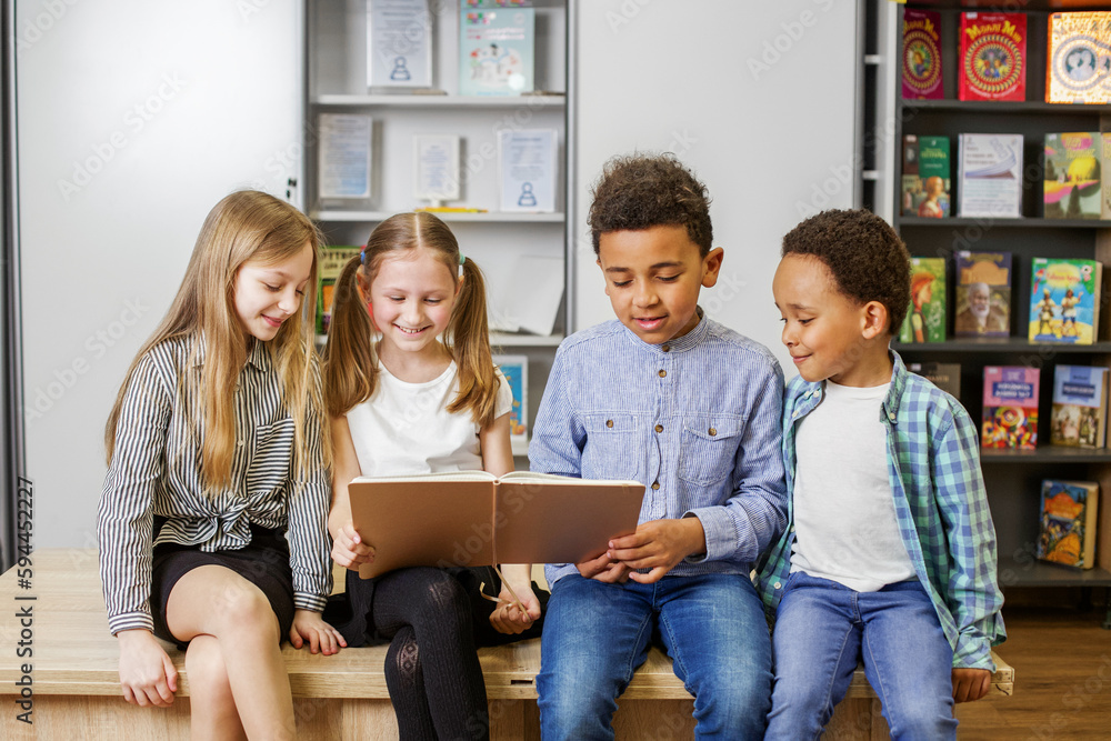 Group happy children reading book in classroom. Back to school. Study and education concept