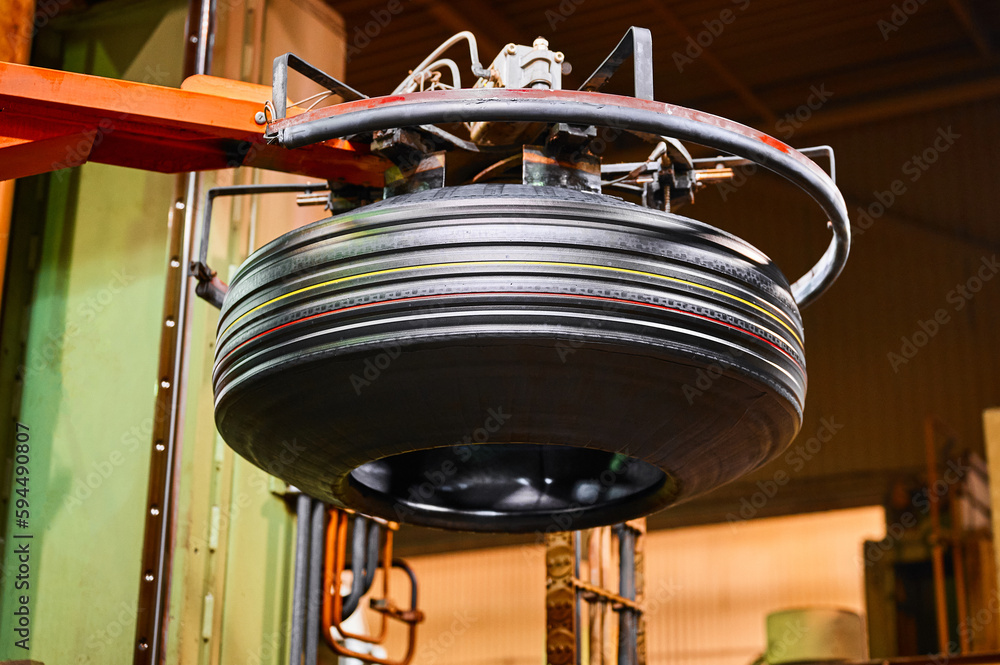 Robotic arms hold new car tires in production plant shop