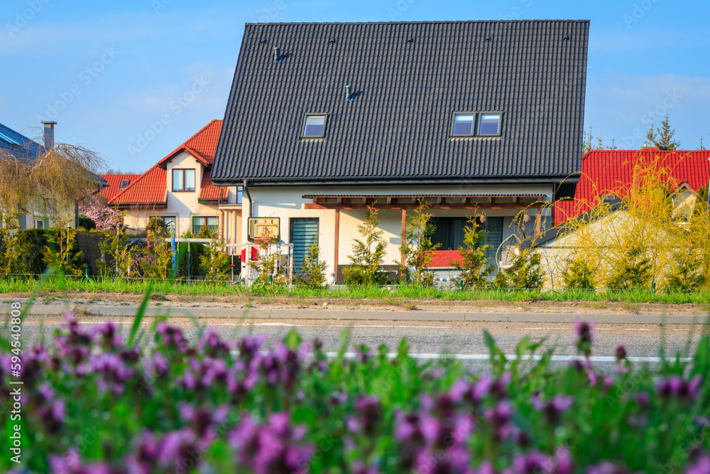 Single-family house surrounded by blooming trees and flowers in spring. Poland