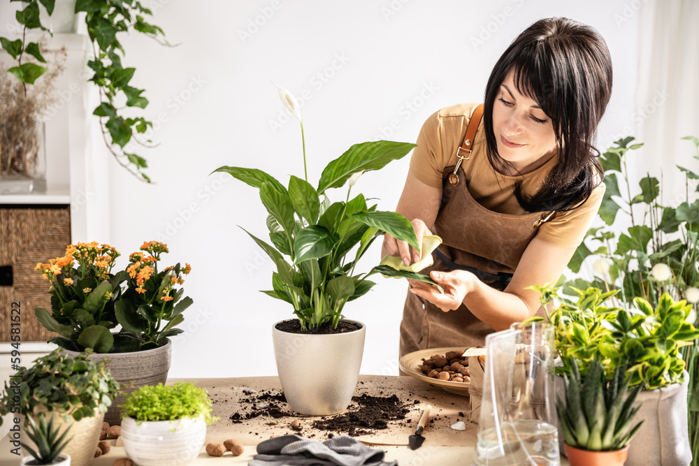 Female gardener wiping white peace lily spathiphyllum plant leaves working at workshop. Planting of home green plants indoors, home garden, hobby, gardening blog, small flower growing business concept