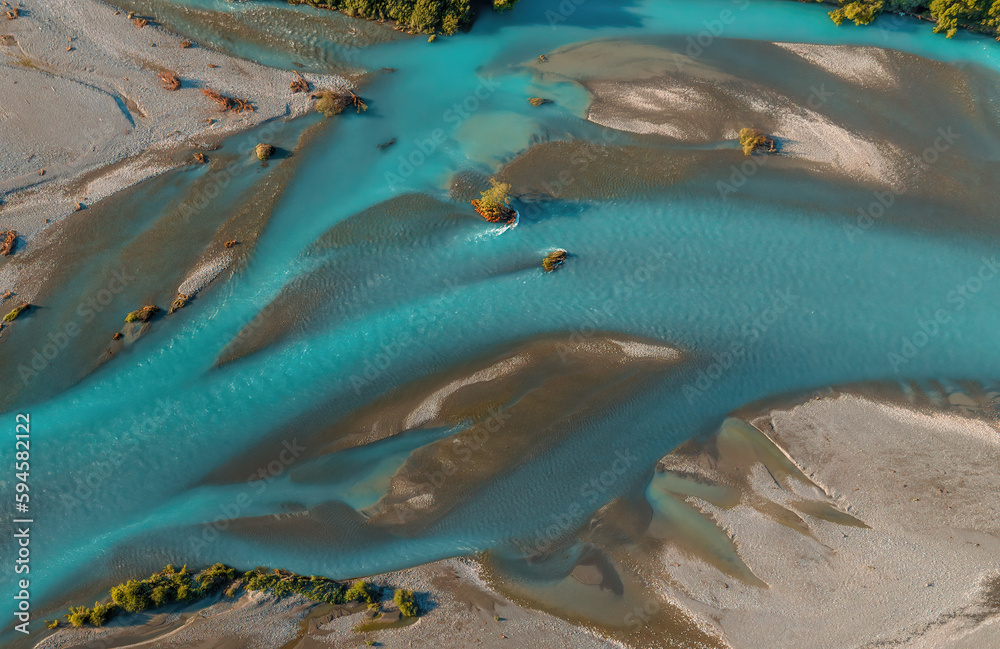 Bird's eye view of river braiding, Aoraki Mt Cook national park, New Zealand. Blue and turquoise water. Aerial drone shot.