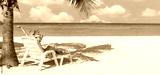 Happy Asian traveler woman relaxing on beach chair at tropical sandy beach with palm tree and beautiful blue sky. Summer vacation concept. Copy space.