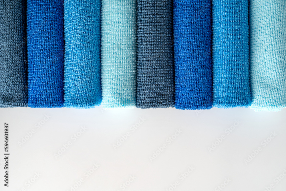 A row of colorful microfiber cloths for housekeeping and cleaning