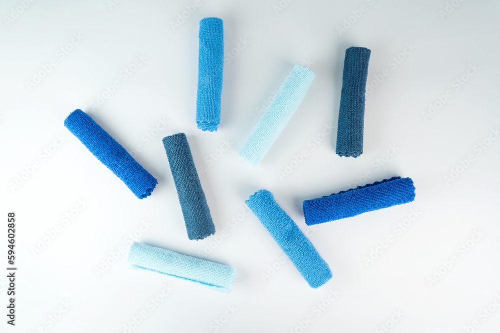 Colorful microfiber towels on a white table. Cleaning and housekeeping concept