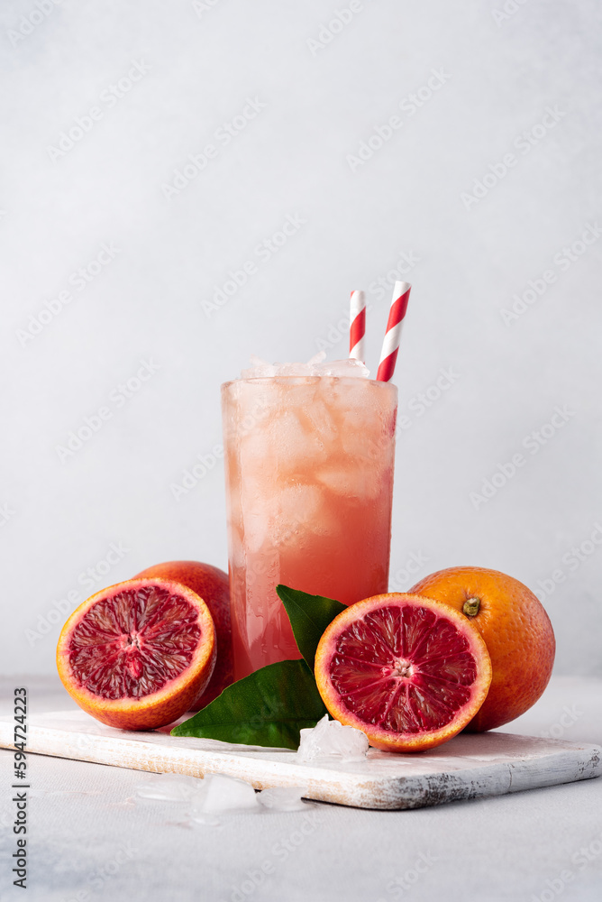Juice or cocktail of red Sicilian oranges with ice cubes in a glass
