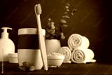 Bamboo toothbrush, towels and other bathroom accessories