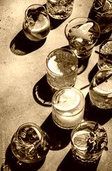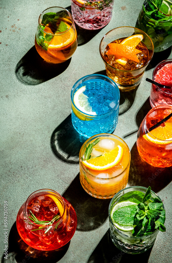 Cocktails set on rusty green bar counter, top view. Mixology concept. Assortment of colorful strong and low alcohol drinks for summer cocktail party. Dark background, hard light