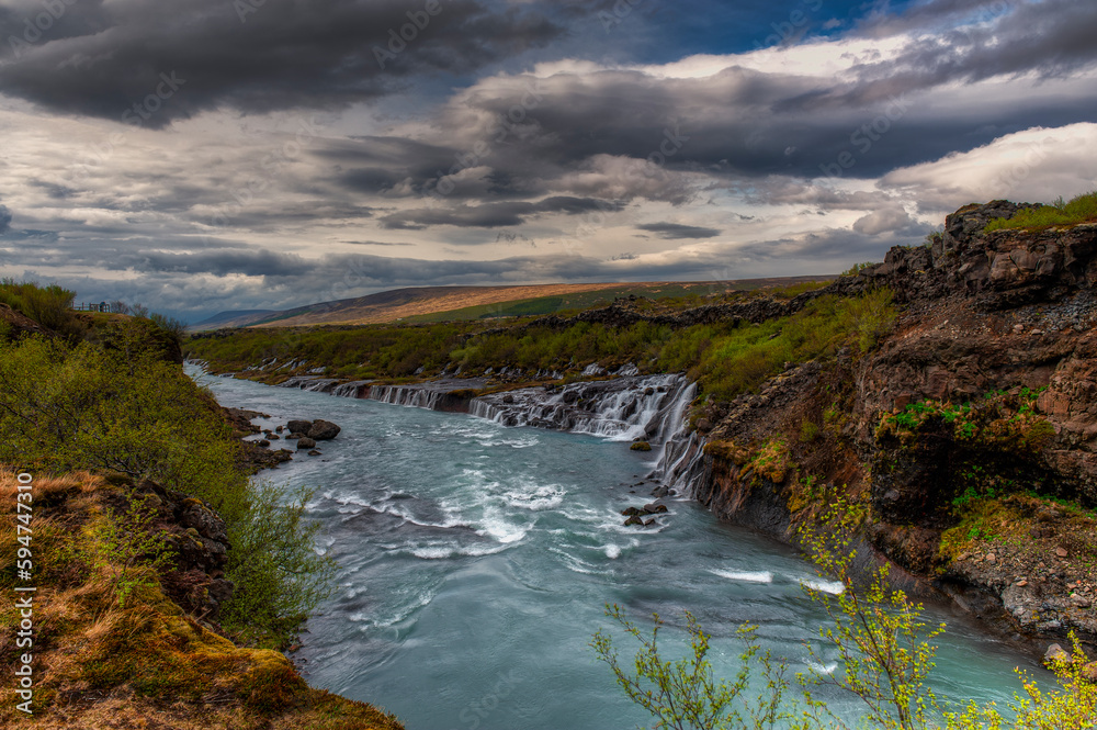 Hraunfossar is a waterfall located in western Iceland, on the Hvitá river,