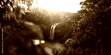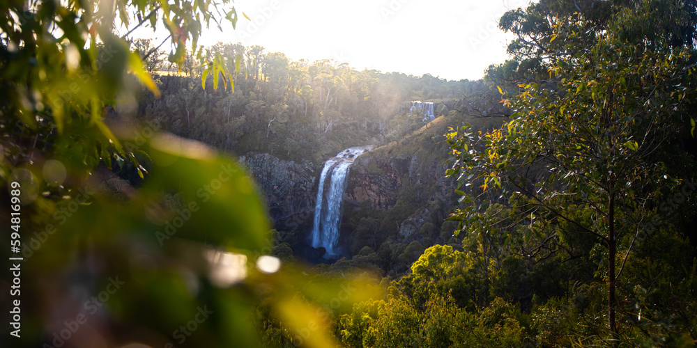 beautiful sunset above famous ebor falls in new south wales, guy fawkes river national park near dorrigo; unique and spectacular double waterfall in australia, halfway between brisbane and sydney