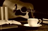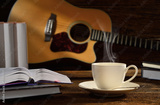 Cup of coffee with books and guitar on wooden table.