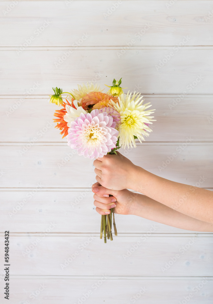 Vertical close up of child's hands holding colorful dahlia flowers - mother's day concept (selective focus)