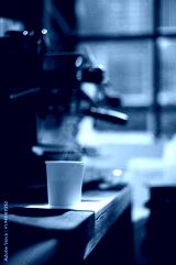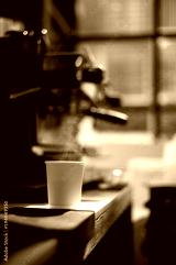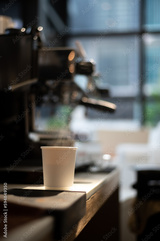 A cup of coffee sits on a table with a coffee machine in the background.