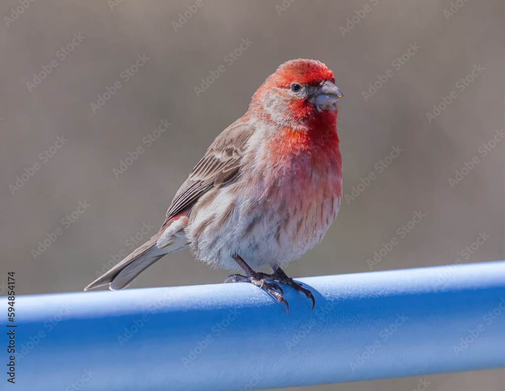 House Finch male perched on railings. Palo Alto Baylands, Santa Clara County, California, USA.