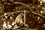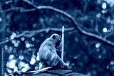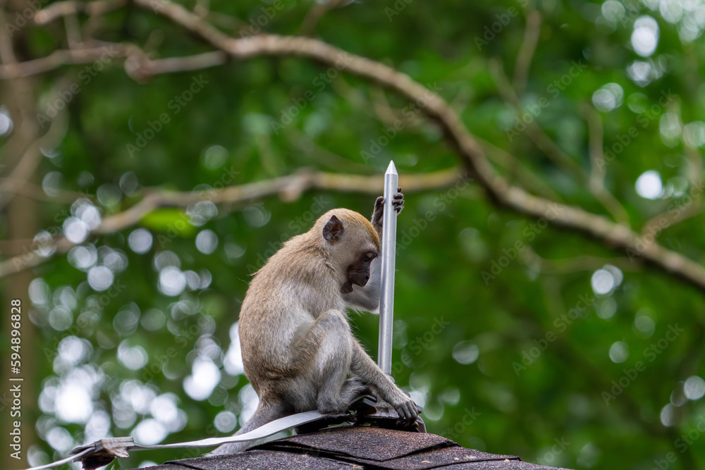 Juvenile long-tailed macaque playing with lightning rod.