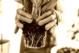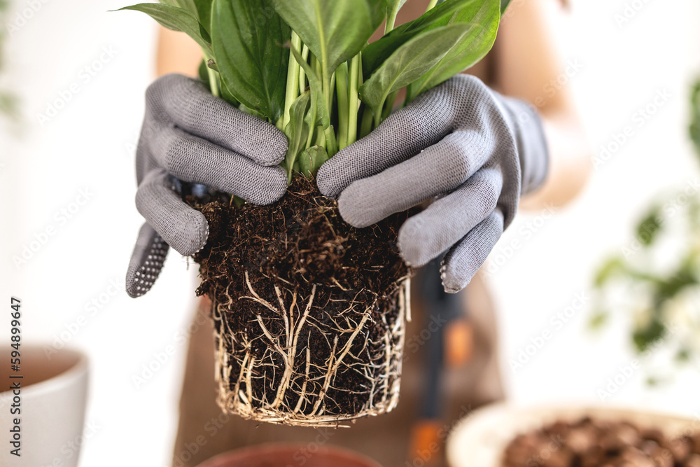 Selective focus, closeup of female gardener hands holding white peace lily, spathiphyllum. Houseplant root system. Selecting a pot for transplanting, repotting indoor plants, spring work room care