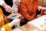 Watercolor Painting Workshop. Teacher distributes clean water over the watercolors with eyedroppers.