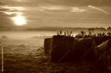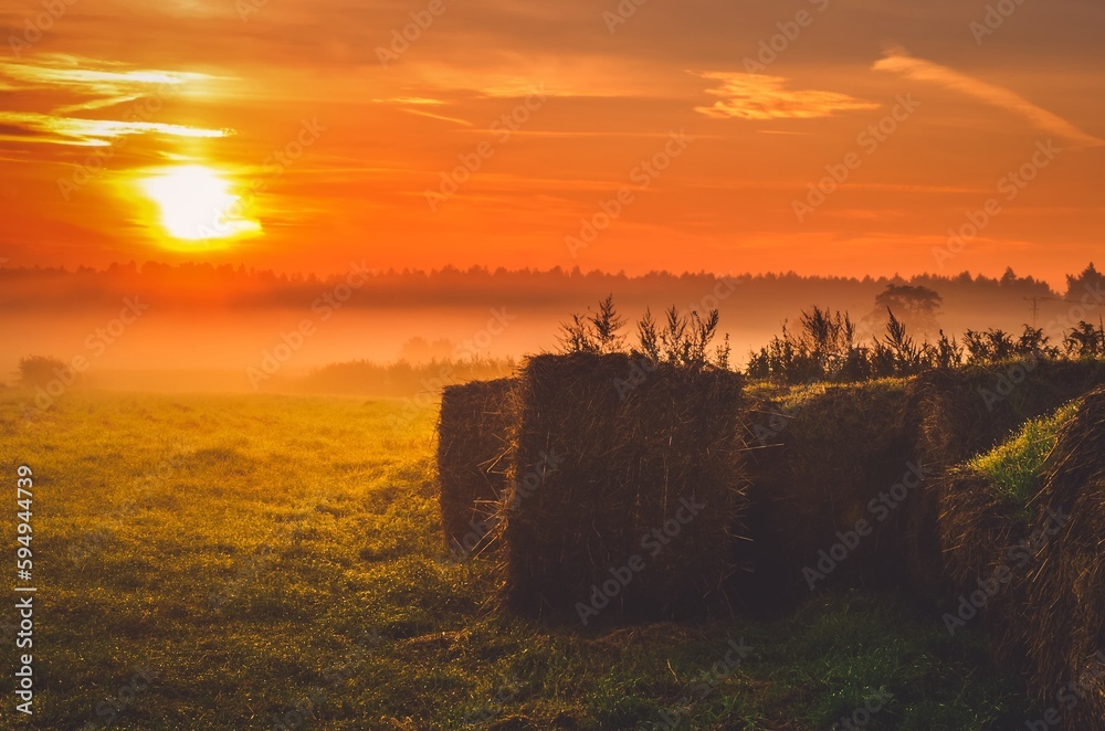 Haystacks on the field in early morning. Straw bales drying on a green grass in summer season during the sunrise, Poland.
