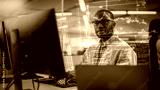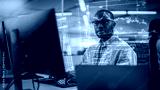 Futuristic Office with Hologram Screens Concept: Portrait of Professional Black IT Specialist Working on Desktop Computer with Holographic Projection Showing Stock Market Information, Big Data, Charts