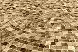 Old cobblestone road top aerial drone view. Abstract background of old cobblestone pavement close up.