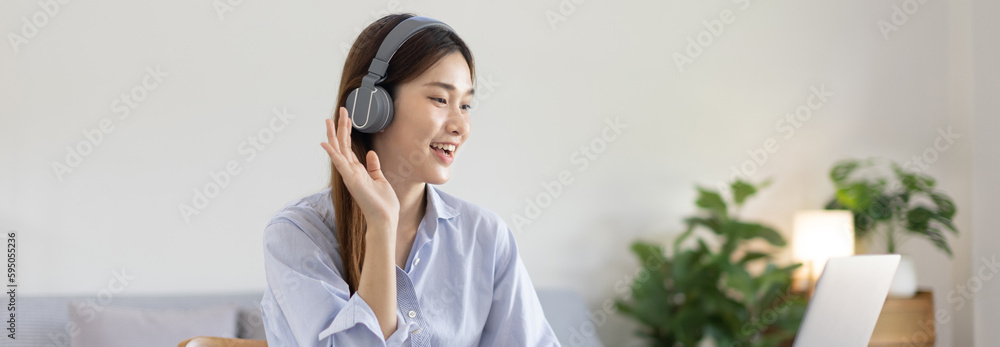 Asian female college student wearing headphones watching live performance or video call teacher teaching on laptop, Conversations with teachers and classmates, Online learning, Study at your own home.