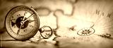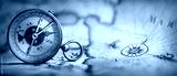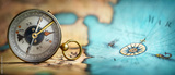 Magnetic old compass on world map. Travel, geography, navigation, tourism and exploration concept background. Macro photo. Very shallow focus.