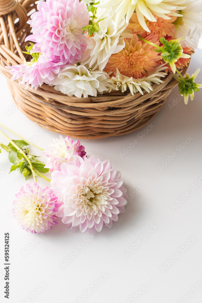 Vertical high angle view of dahlia blossoms on white table with more blossoms in basket in background (selective focus)