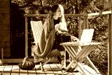 Pretty girl sitting on balcony terrace wrapped in yellow plaid holding cup of tea coffee, looking at laptop. Brunette woman works remotely, reading online. Countryside house. Wood at sunny autumn day.