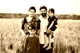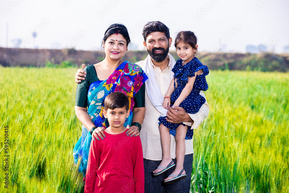 Portrait of happy young indian farmer family standing at wheat agriculture field, Parents with children outdoor, Rural india concept.