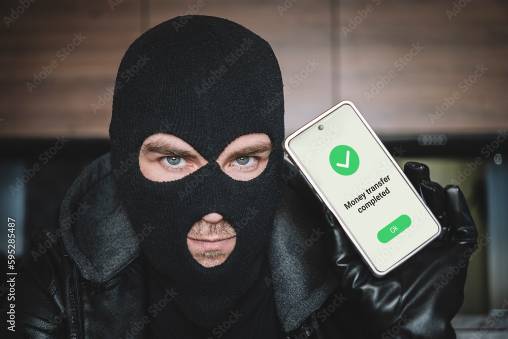 Mobile banking hack cyber security concept. Hacker and criminal login to persons online bank application and steal money from account with smartphone. stealing money from bank account.