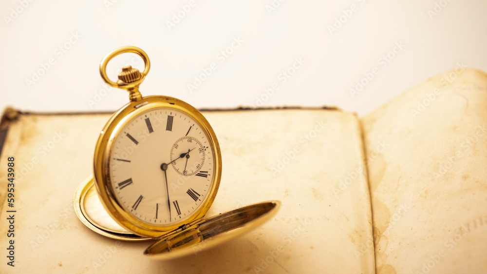 vintage gold pocket watch longines isolated on white background, pocket watch on books background